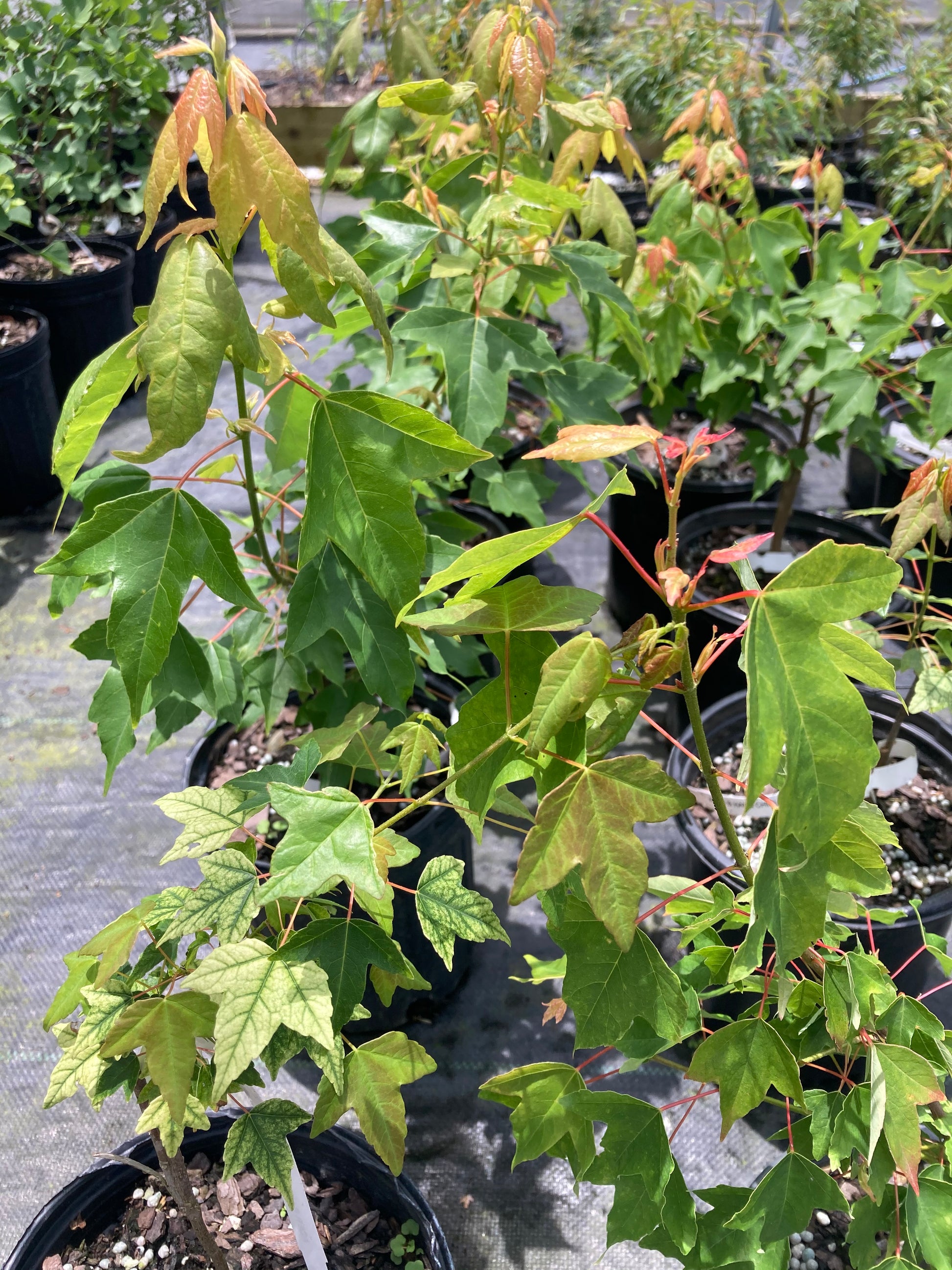 The new growth in spring is white with green veining. Young leaves in the summer are orangish. Fall color tends towards the reds.