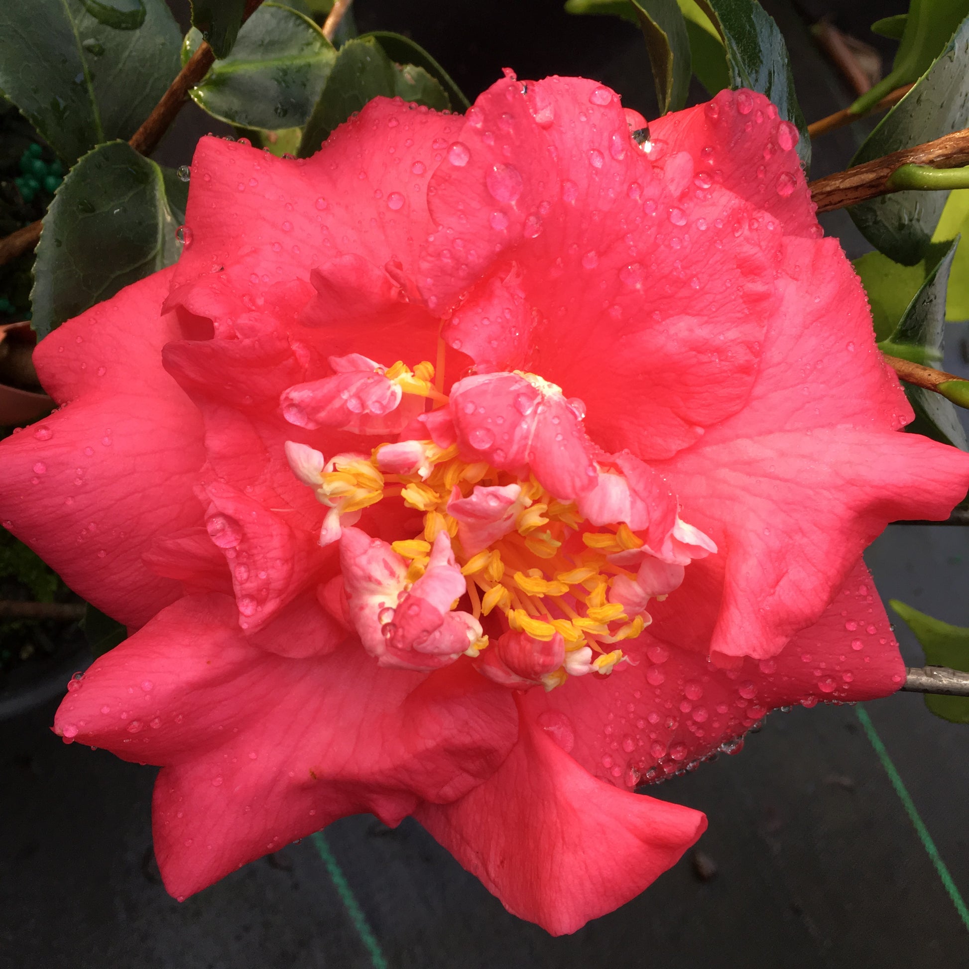 First appearing in Japan as 'Akashigata' in 1898, 'Lady Clare' has semi-double flowers with a distinct column of stamens. A very dependable, weather-tough landscape plant, large specimens can often be found in old gardens in NC. This is a triploid variety which means it has three sets of chromosomes rather than the two sets usually found in C. japonica. The leaves are large and thick while the plant has a somewhat spreading growth habit.